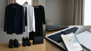 近年購入したブラックフォーマル、またはダークスーツがあり、サイズが問題ない場合。三回忌以降で、案内に「平服」と明記され、親族内もカジュアル寄りの雰囲気の場合。参列のみで、会食がなく短時間の滞在の場合。靴、バッグ、アクセサリーまで含めて、全体が弔事仕様で揃っている場合です。